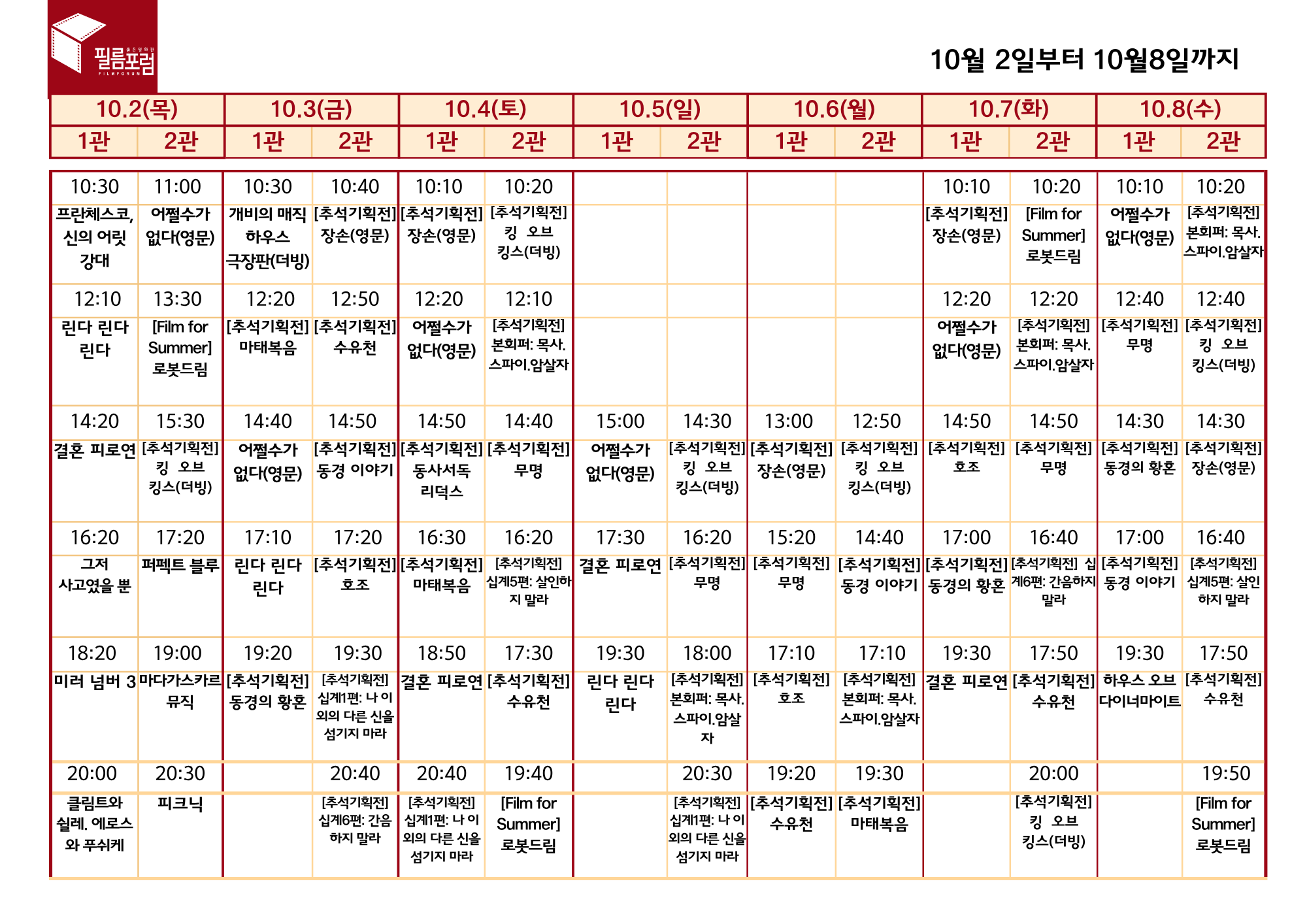 ![]() [추석기획전] 필름포럼 10월2일(목) ~ 10월8일(수) 주간 상영안내