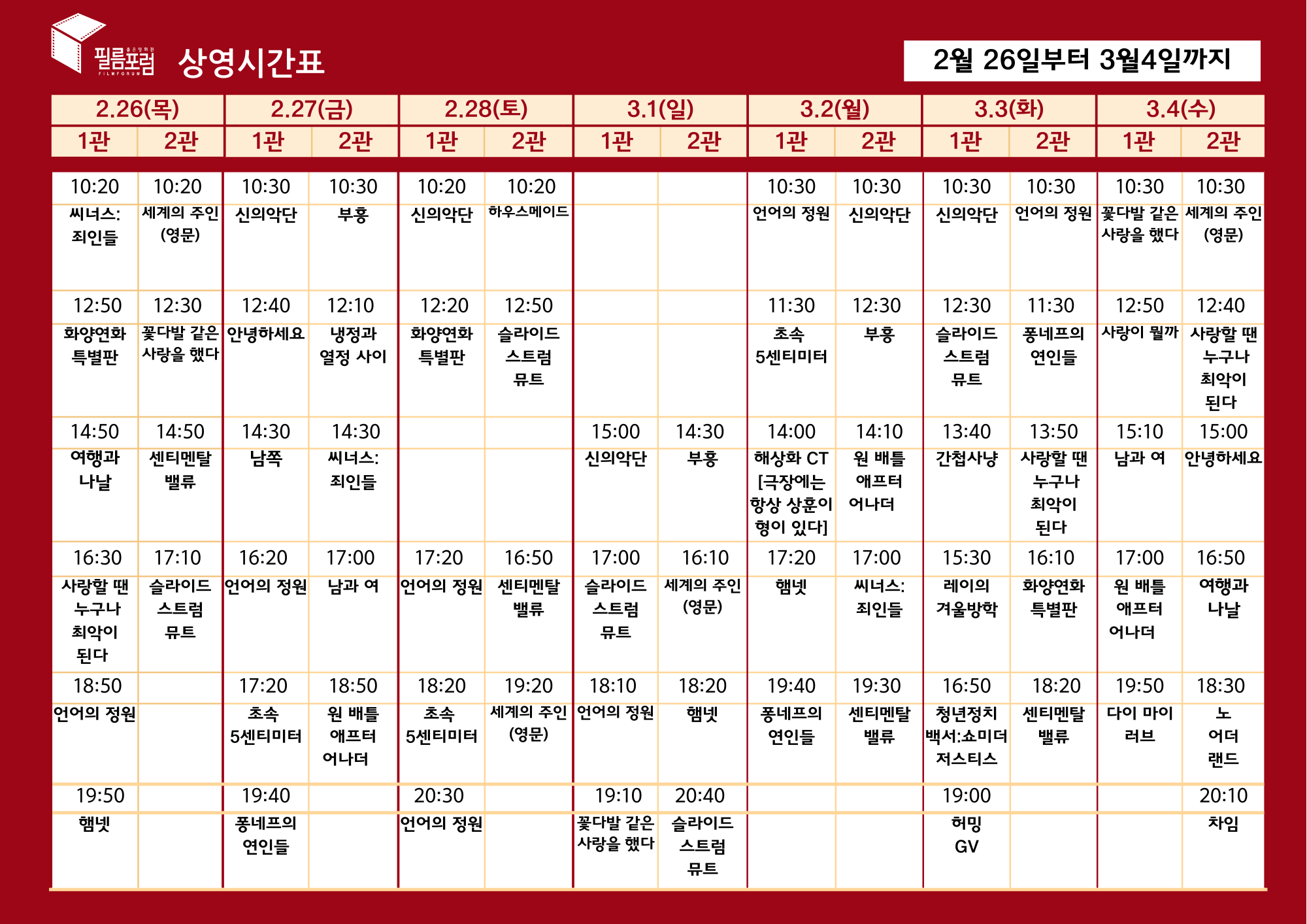 ![]() 필름포럼 2월26일(월) ~ 3월4일(수) 주간 상영안내